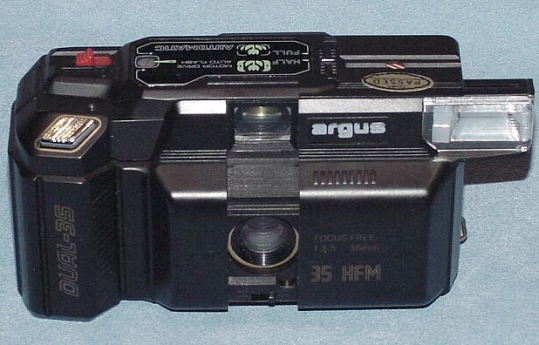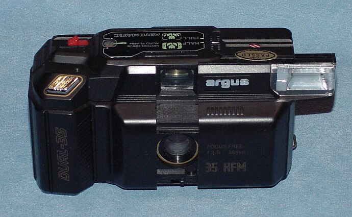 Has the capability of taking half frame or full frame pictures switching between the two on a single roll of film by a lever. Albada frames in finder, Program, free-focus, motor drive, built in flash, this is a simply but efficient dual format camera. |