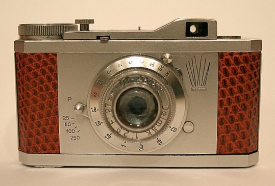Made by C.O.M.I, which stands for Costruzioni Ottico Meccaniche Italia Rome. Description: Small 35mm half frame camera for 20 exposures 18x24mm. Delmark f2.9/27mm lens, between the lens shutter with speeds 1/25- 1/250. Chrome, black leather, in makers leather ever ready case and lens cap.