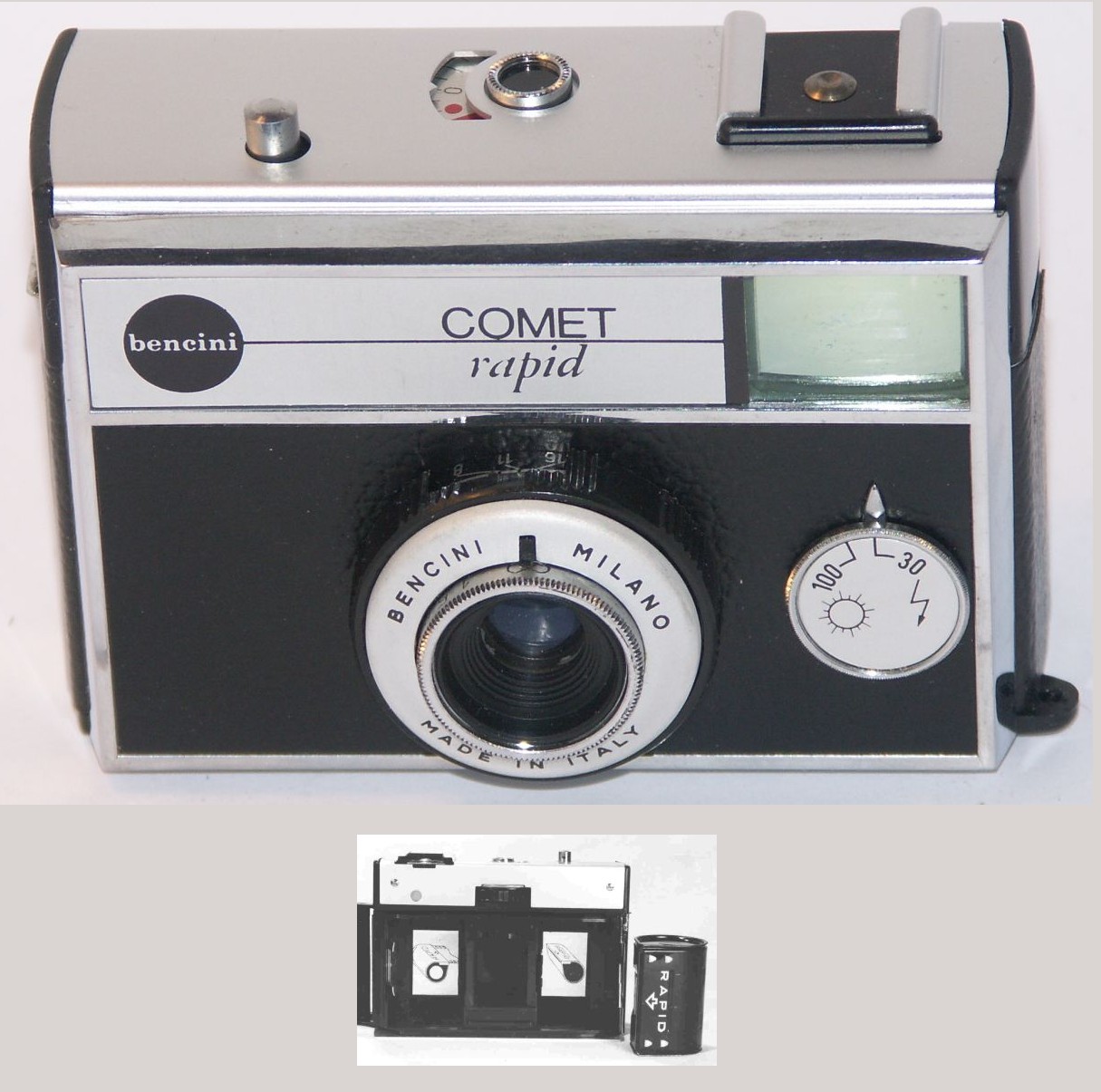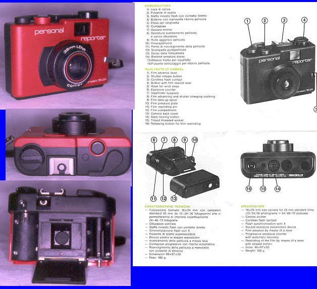 Formato 18x24mm su caricatori standard. Obiettivo Comet 39mm f/8, otturatore con velocità unica 1/100. Leva di carica rapida, manovella di riavvolgimento, staffa con contatto diretto, dorso rimovibile. |