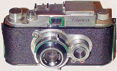 In 1955 the Toyohashi Tougodo factory launched this camera (also known but rare with a Hulda badge). It is clearly a descendant of the wartime Meikai, but better made and now using standard 35mm cassettes. It is 60% heavier than its predecessor and works quite smoothly. Lens is an Owla Anastigmat 4.5cm f/3.5 in NKS shutter, 1-200 & B (which looks just like a Compur rimset) with F and X sync.